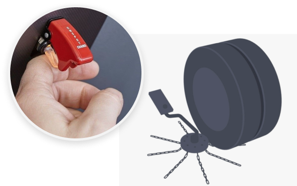 Flip the dashboard switch and a chain wheel is lowered so that it contacts the inside of the tire. The friction causes the chain wheel to rotate, creating enough centrifugal force to swing the chains out and under the tire.