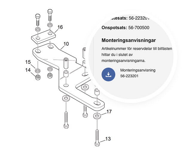 Du kan också finna reservdelar direkt i monterningsanvisningen om du redan har artikelnummer på bilfästesatsen.
